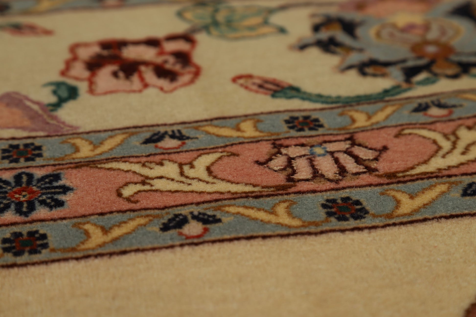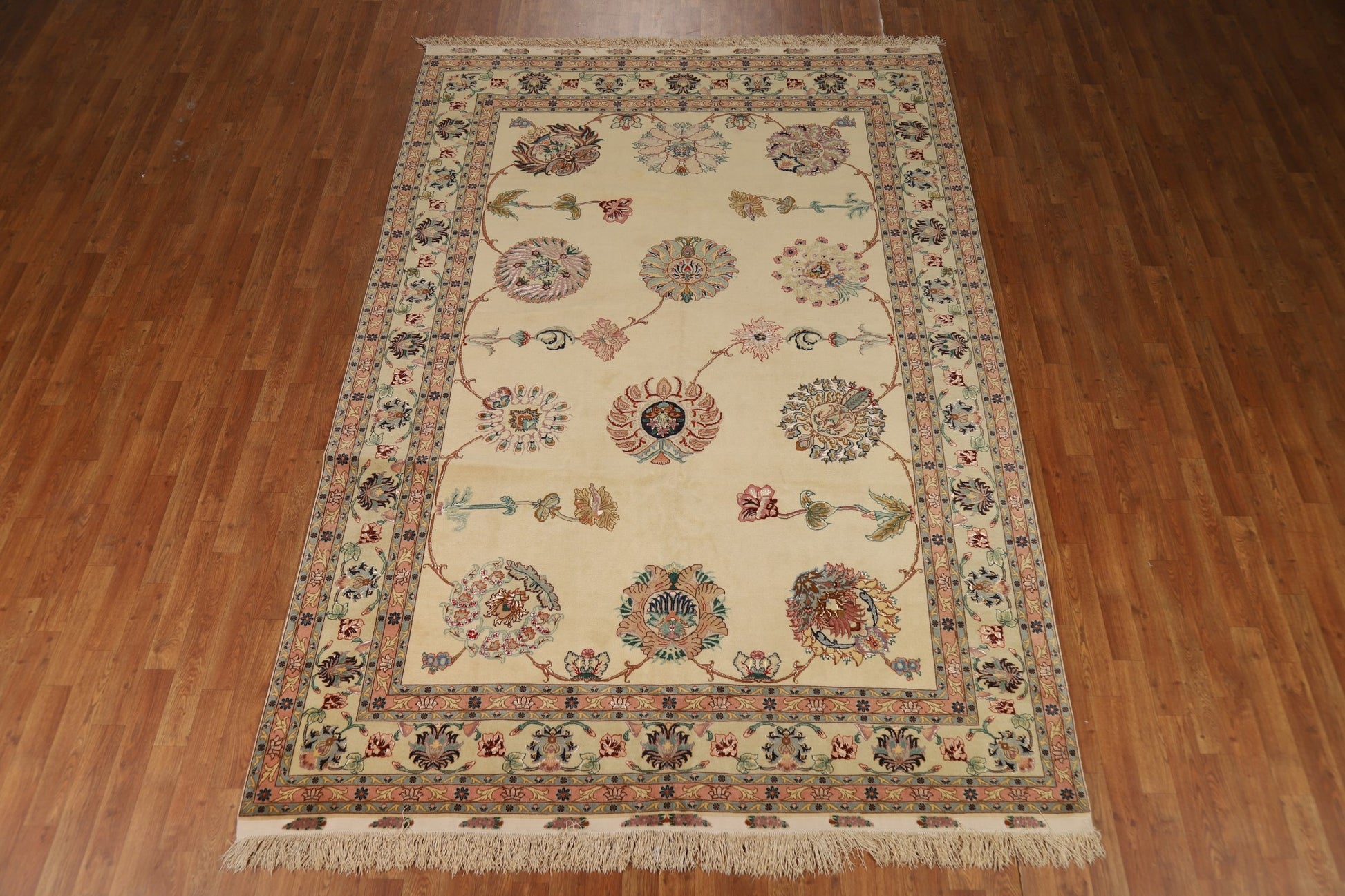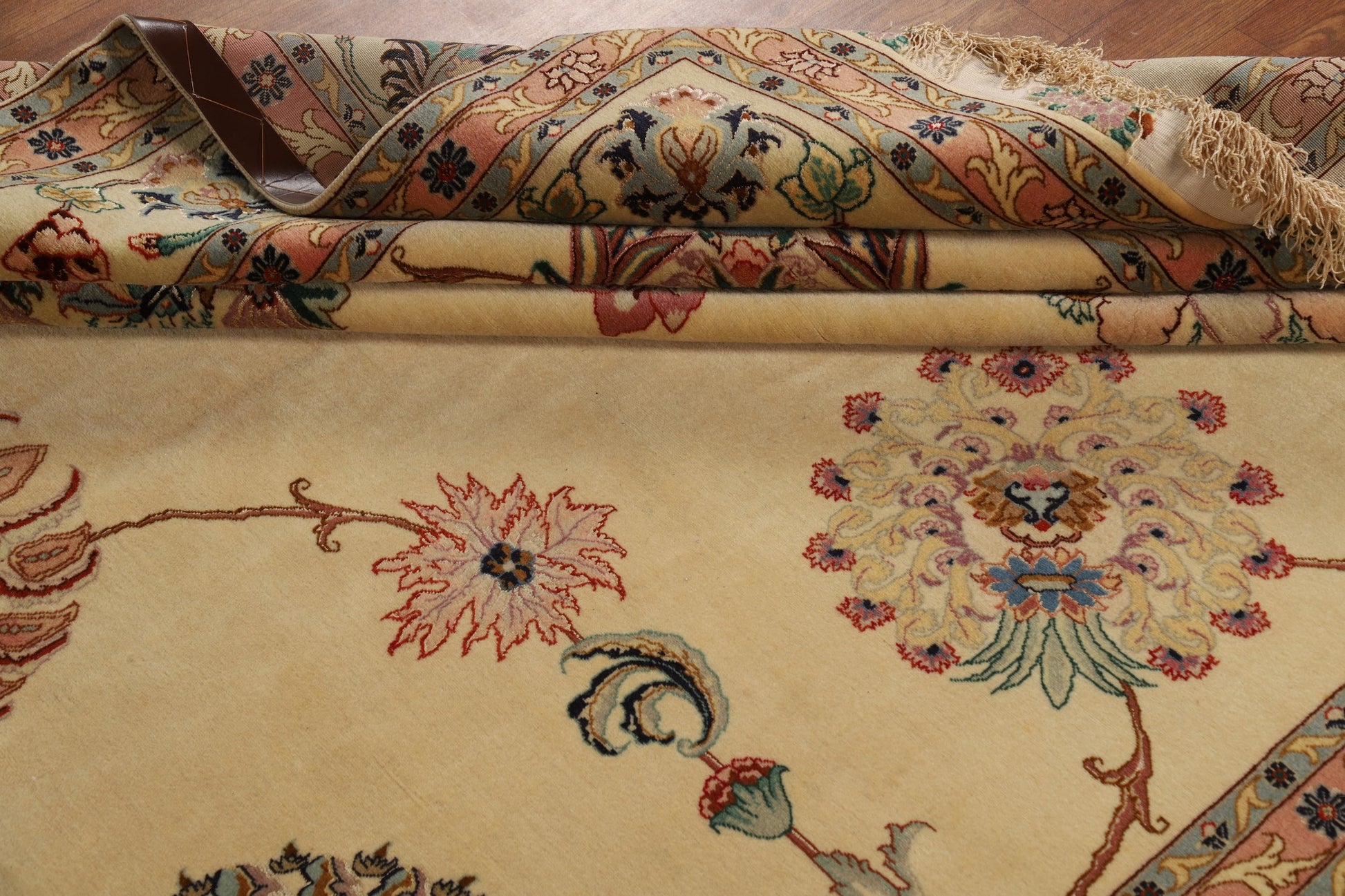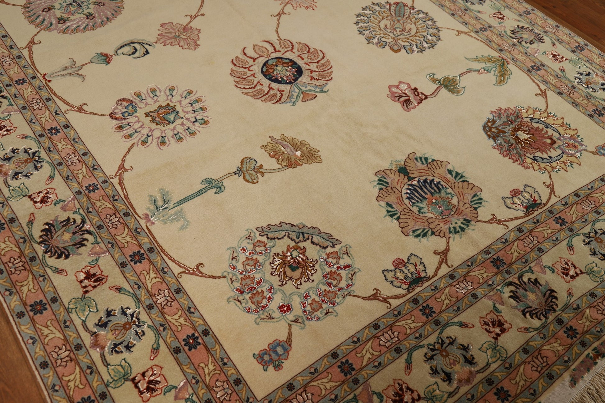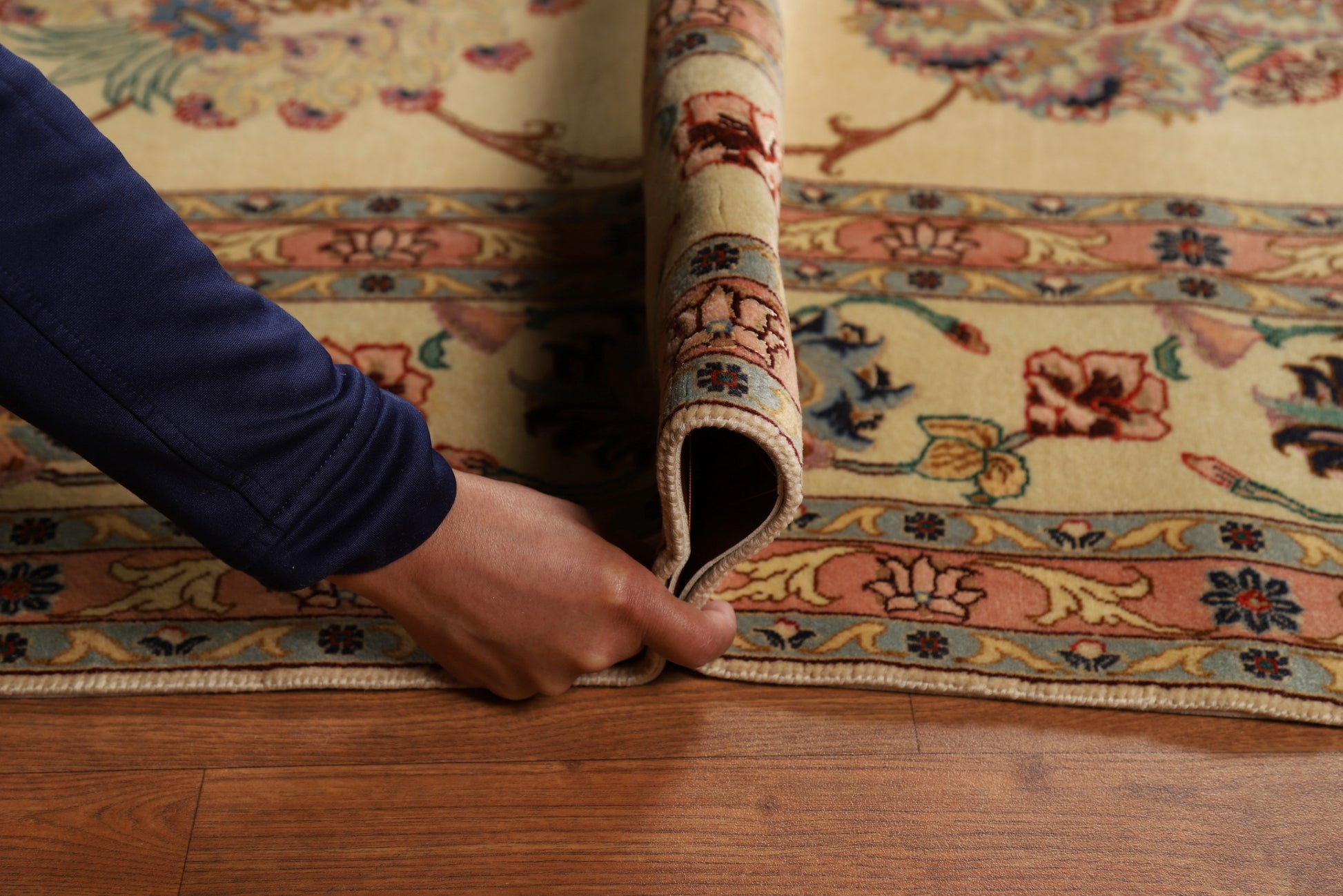 A Beautiful Genuine Persia ( Persia ) Tabriz rug is Hand Knotted by skillful weavers in Persia ( Persia ) with Wool & Silk Material. This rug is in New, First Quality condition. dimensions are 10' 1'' X 6' 8'' in foot and 307 X 203 in centimeter. the primary color is Beige & Ivories.