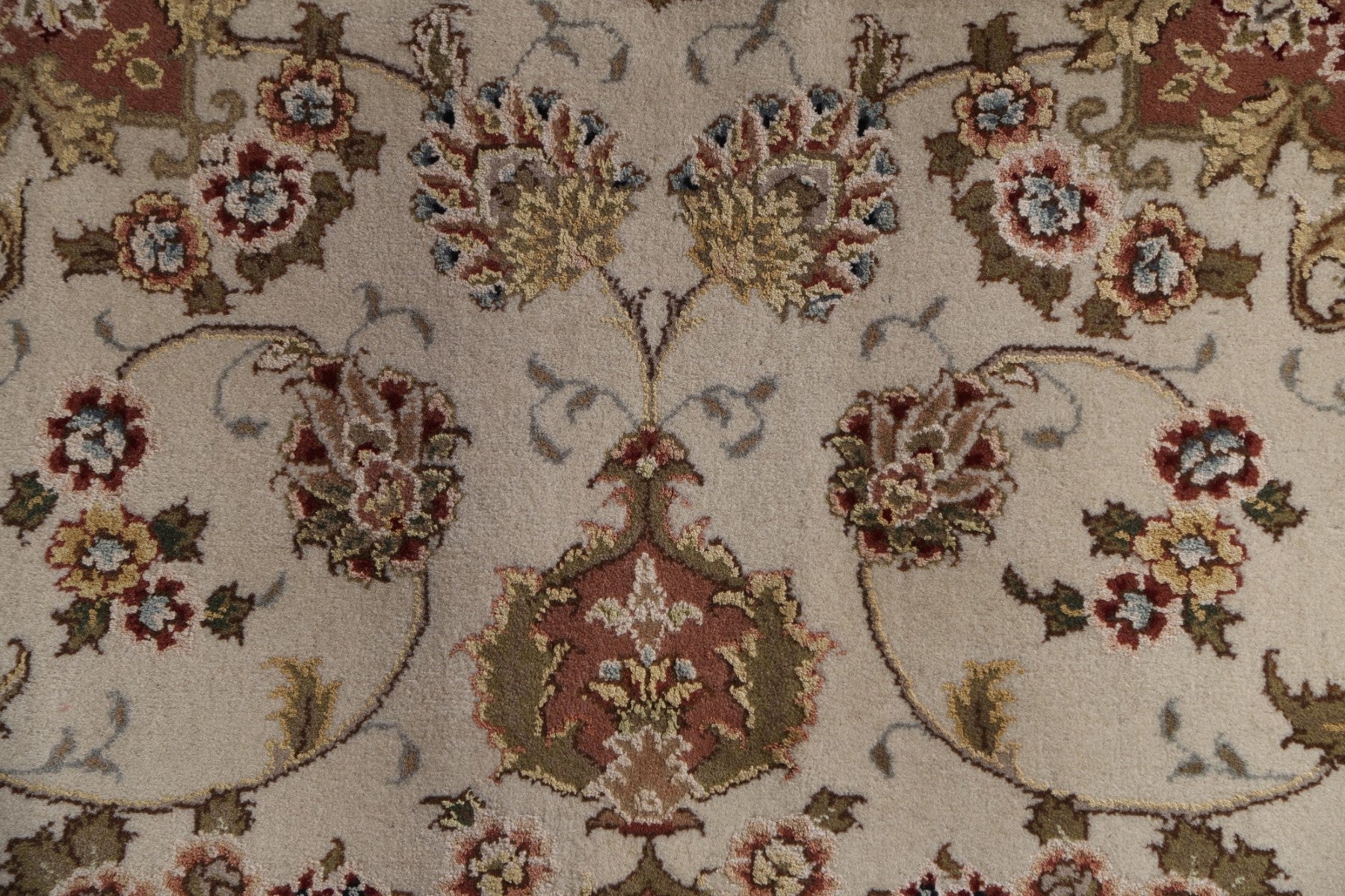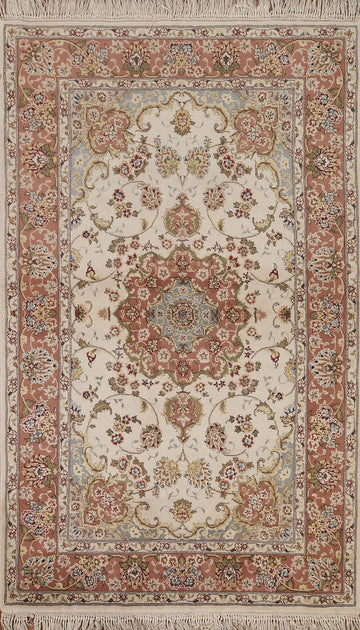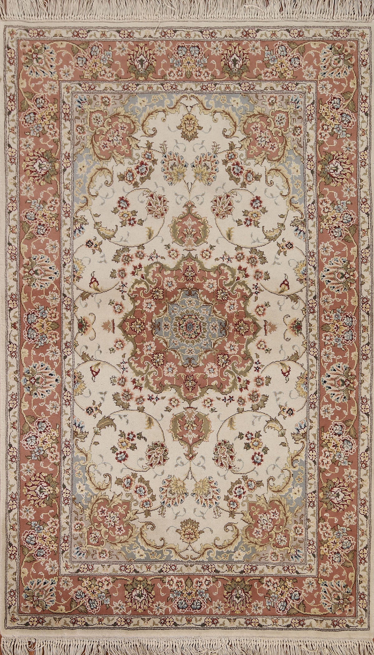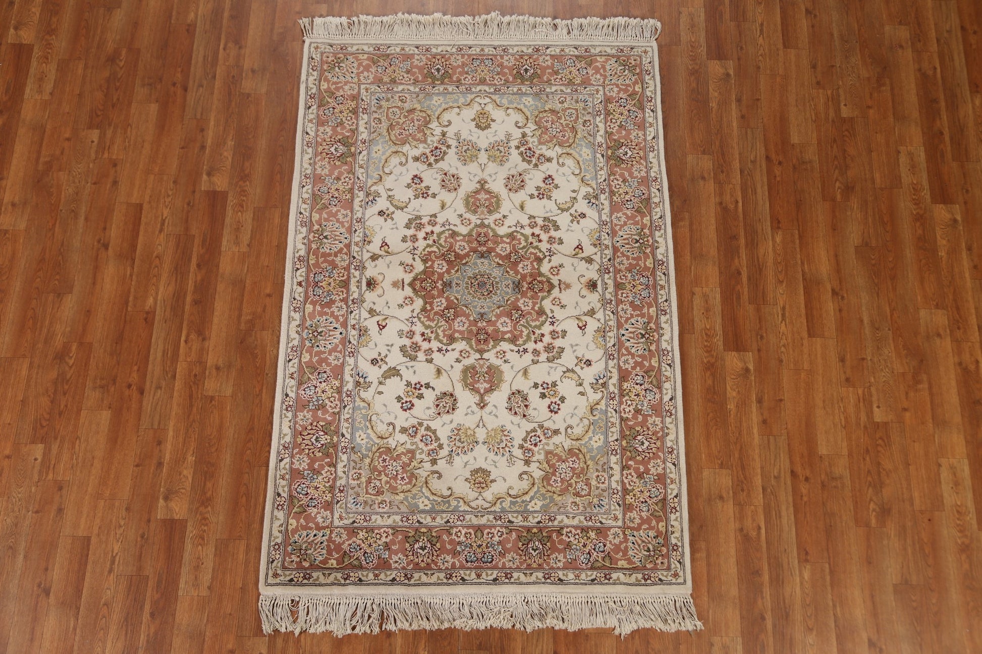 A Beautiful Genuine Persia ( Persia ) Tabriz rug is Hand Knotted by skillful weavers in Persia ( Persia ) with Wool & Silk Material. This rug is in condition. dimensions are 5' 9'' X 3' 10'' in foot and 175 X 117 in centimeter. the primary color is Beige & Ivories.