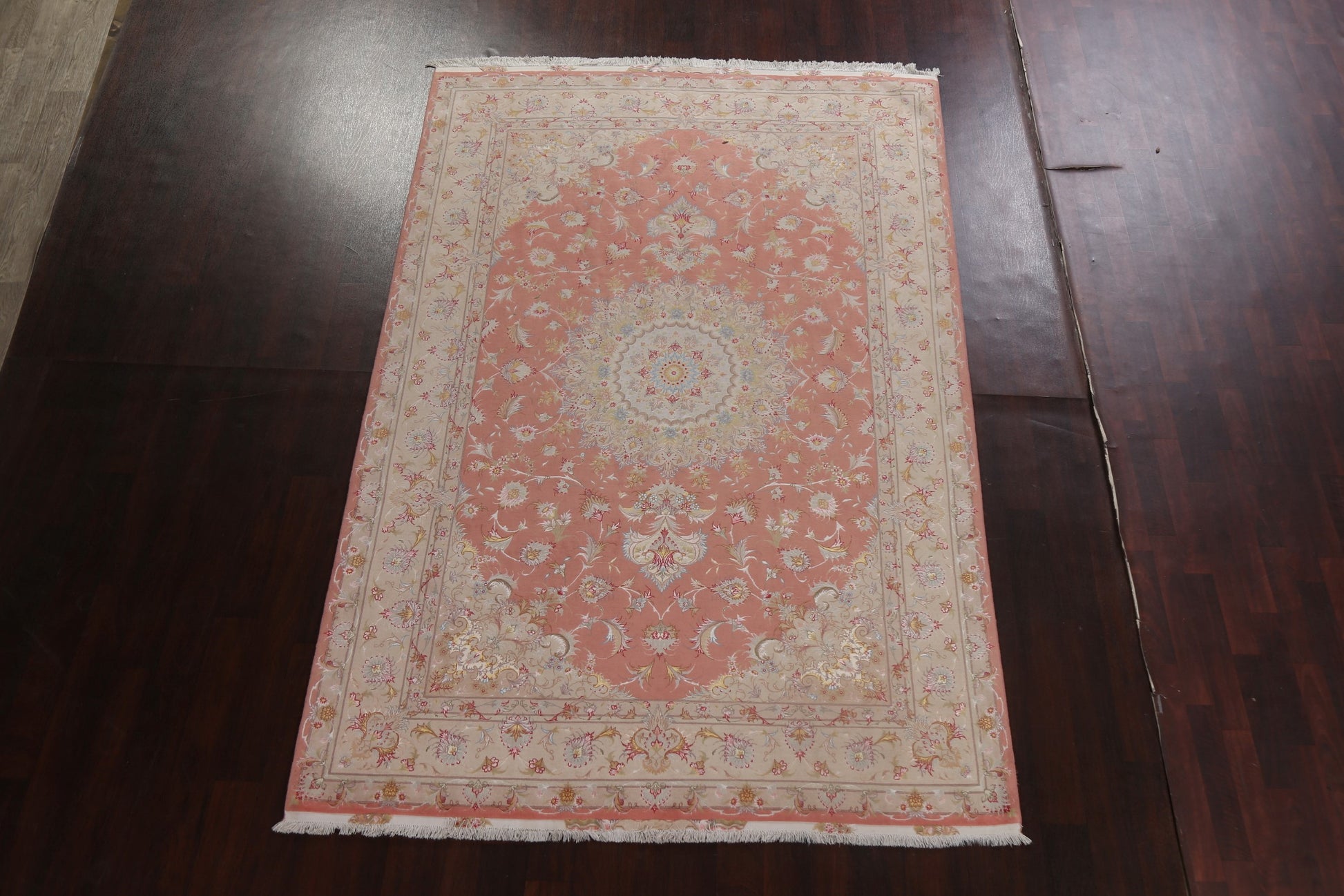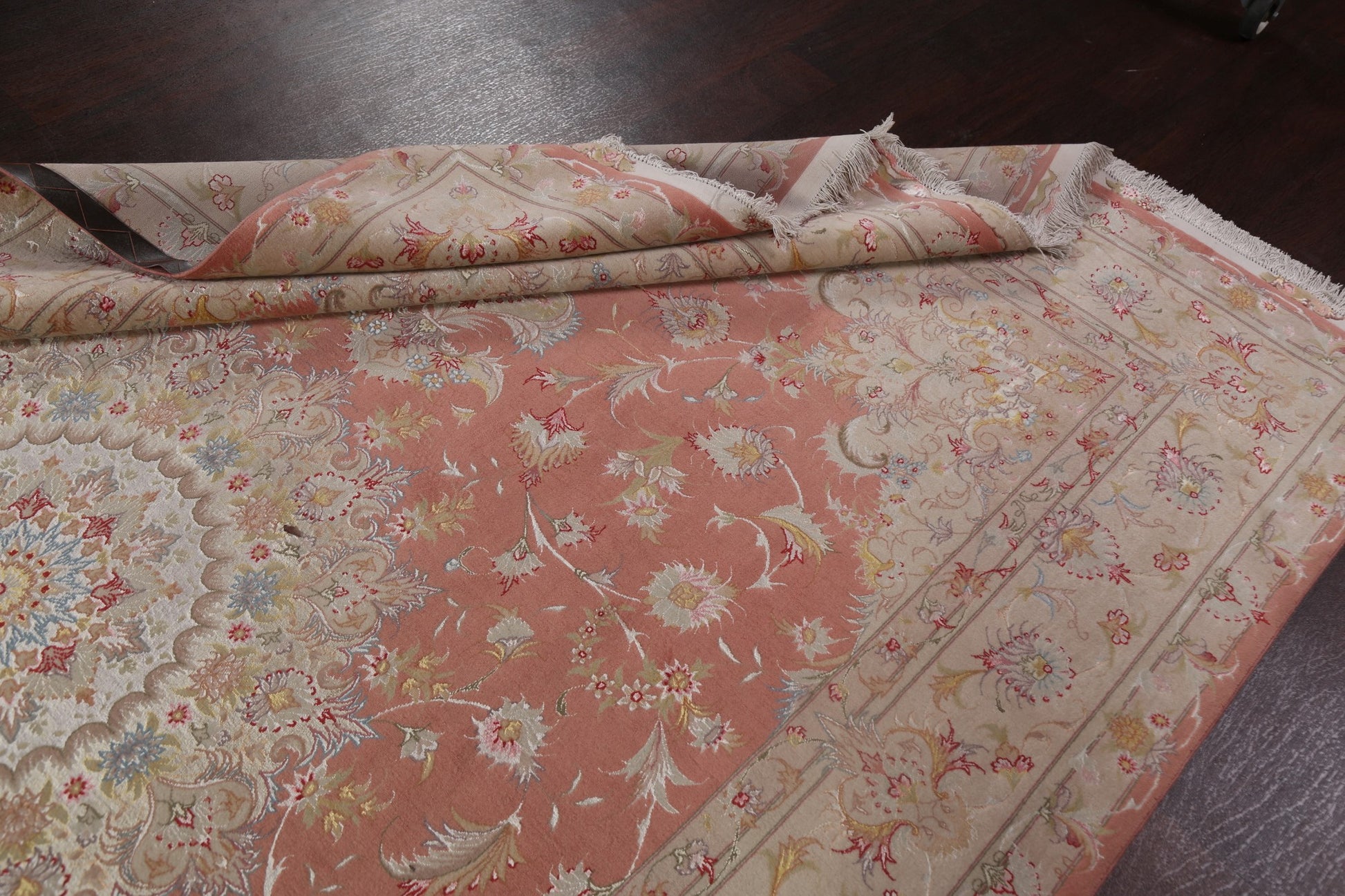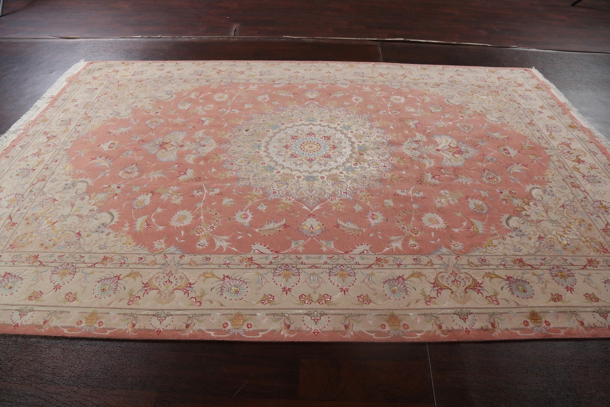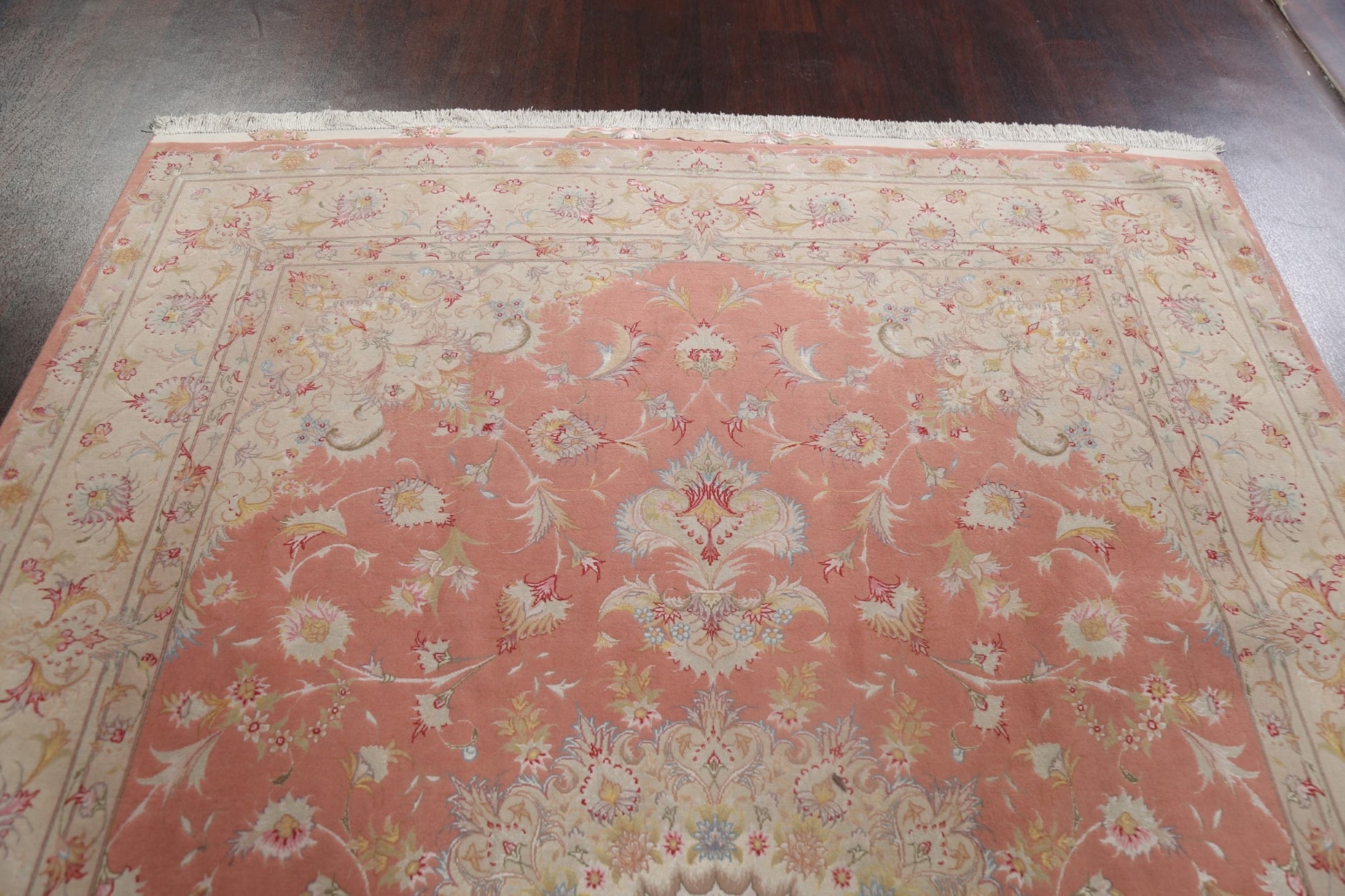 A Beautiful Genuine Persia ( Persia ) Tabriz rug is Hand Knotted by skillful weavers in Persia ( Persia ) with Wool & Silk Material. This rug is in New, First Quality condition. dimensions are 10' 2'' X 6' 6'' in foot and 310 X 198 in centimeter. the primary color is Pink.