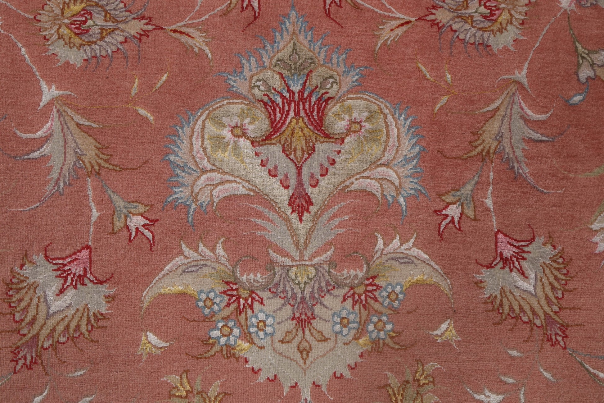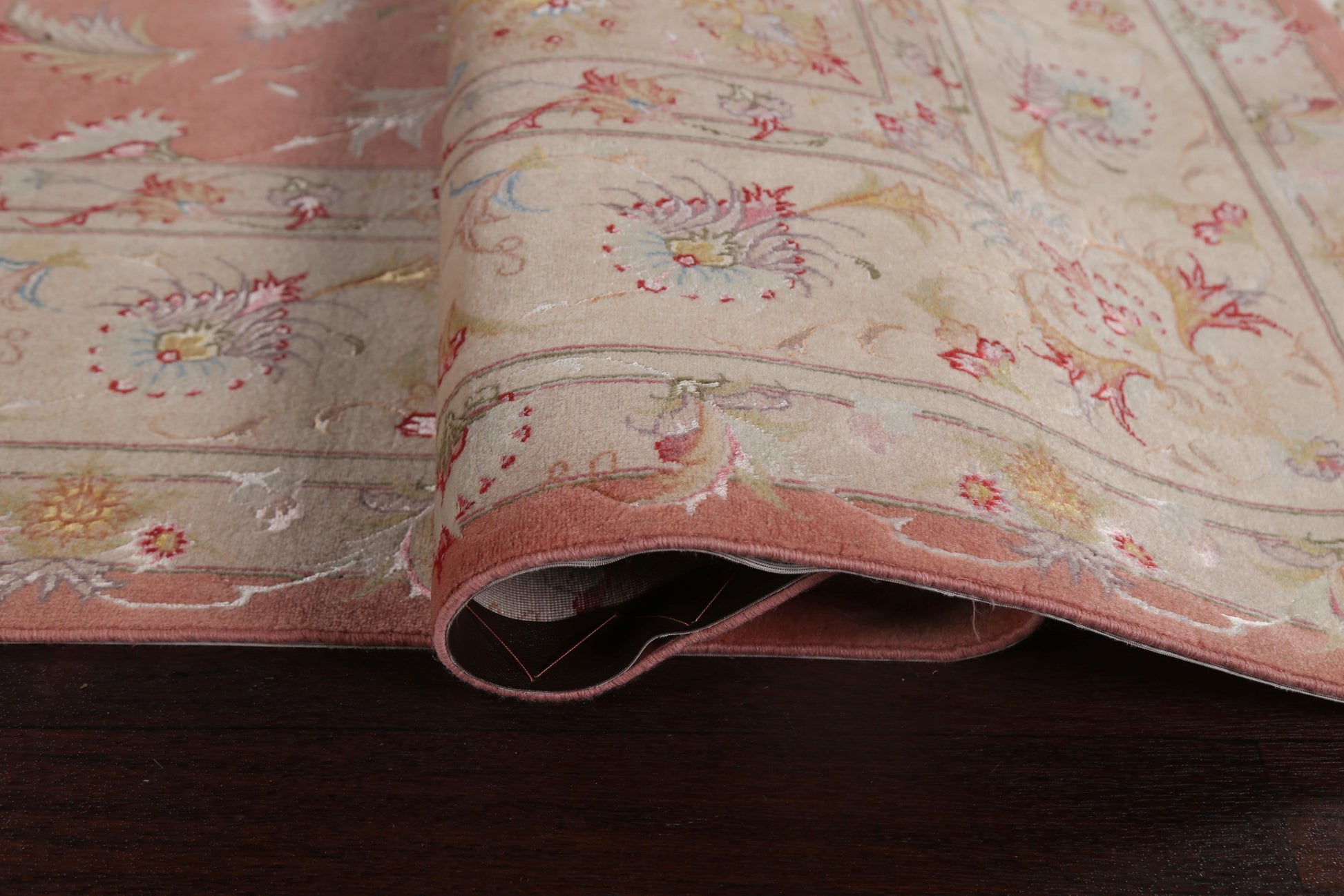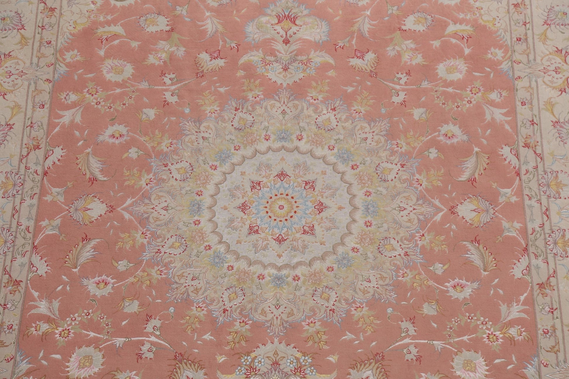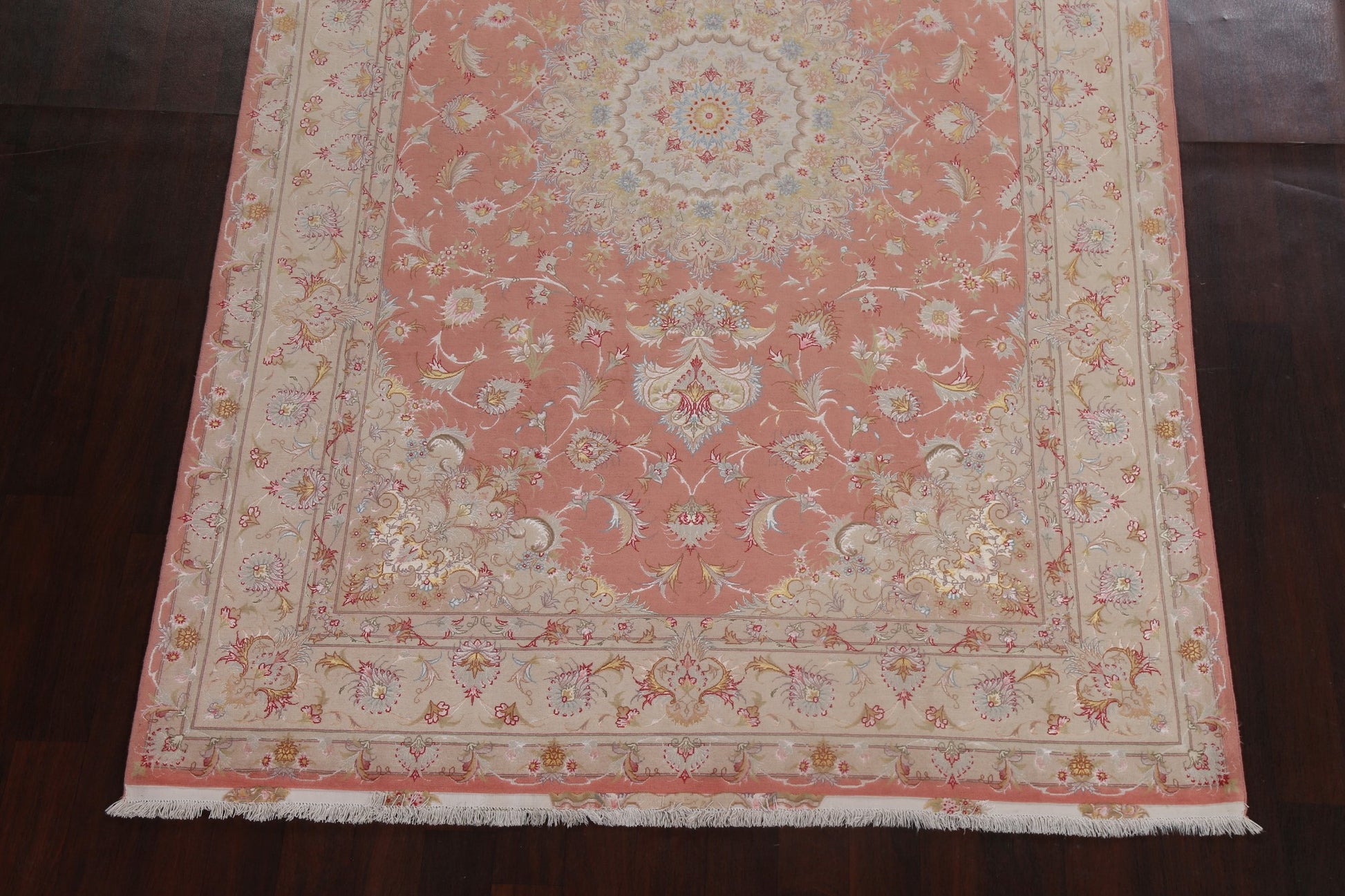 A Beautiful Genuine Persia ( Persia ) Tabriz rug is Hand Knotted by skillful weavers in Persia ( Persia ) with Wool & Silk Material. This rug is in New, First Quality condition. dimensions are 10' 2'' X 6' 6'' in foot and 310 X 198 in centimeter. the primary color is Pink.